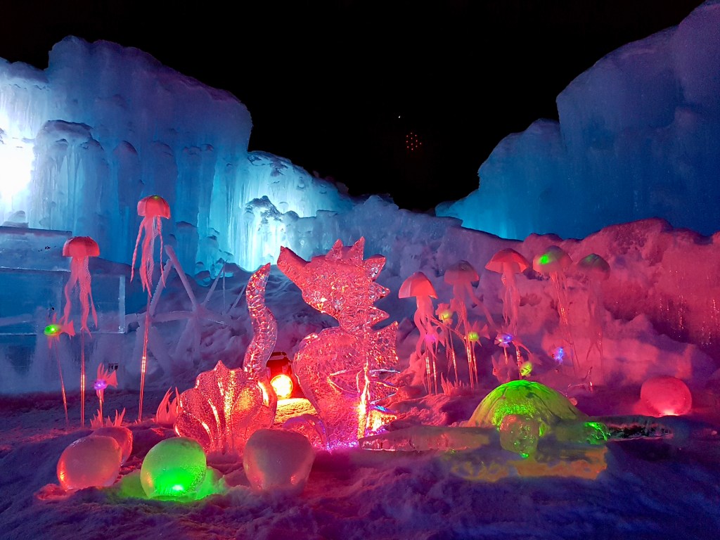 The result is a magical fairytale world of ice with tunnels, slides, thrones, fountains and beautiful displays to enjoy.